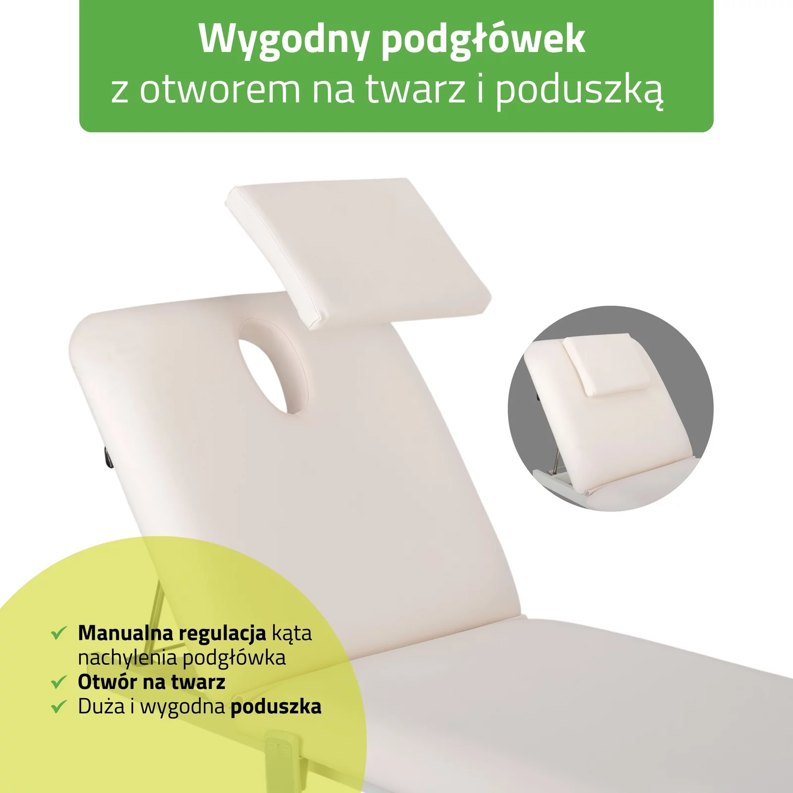 - Otwór na twarz z dużą poduszką — komfort w pozycji na brzuchu oraz wygoda po zamknięciu otworu.