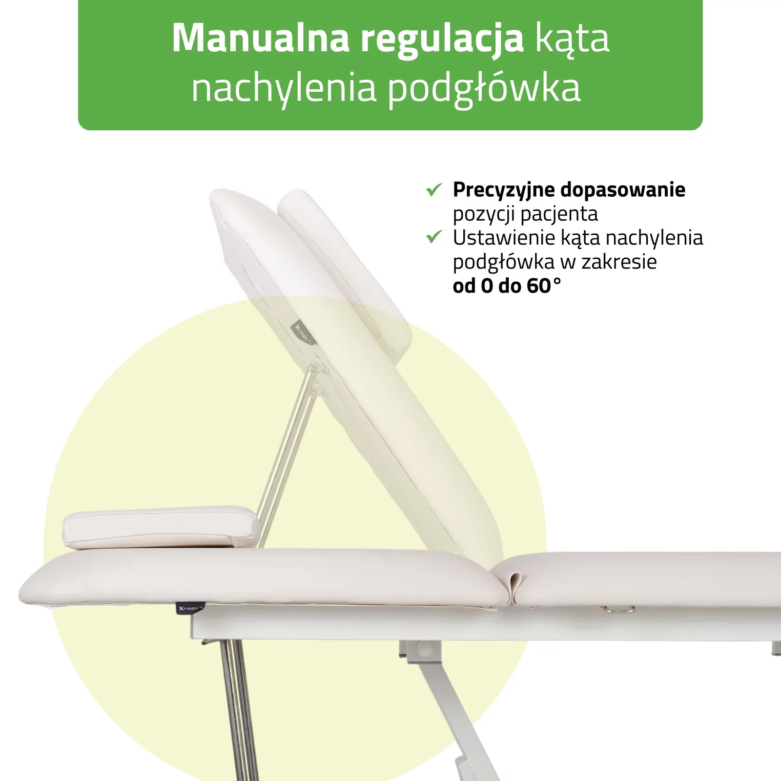 - 2-segmentowy blat z regulowanym zagłówkiem — możliwość ustawienia kąta nachylenia do +60°.