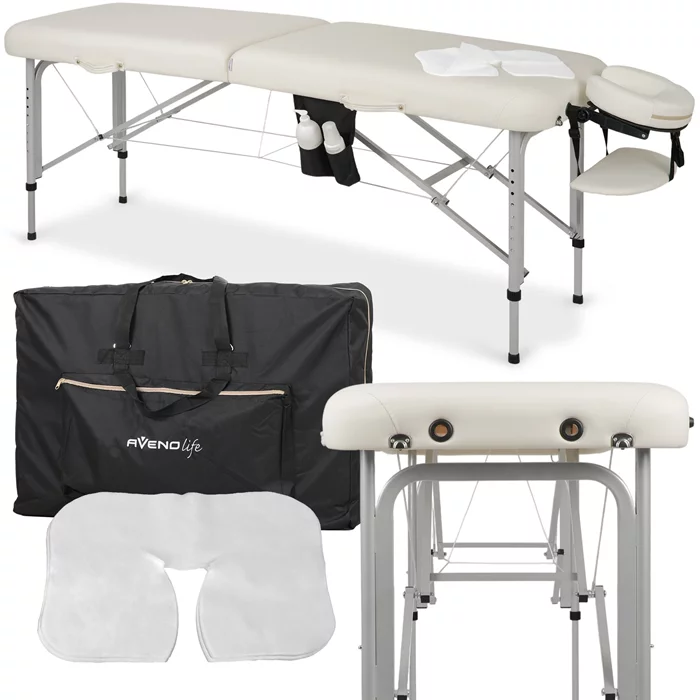 Składany stół do masażu Vera marki Aveno Life to propozycja dla mobilnych specjalistów, którzy nie chcą rezygnować z komfortu pracy w żadnych warunkach. Ten aluminiowy stół do masażu wyróżnia się innowacyjną konstrukcją w kształcie litery U, która umożliwia ergonomiczną pracę w pozycji siedzącej – idealną podczas masażu twarzy, terapii manualnej czy refleksologii. Dzięki ultralekkiej budowie (tylko 13,5 kg z akcesoriami) oraz kompletowi praktycznych dodatków, stół do masażu Vera sprawdzi się zarówno w gabinecie, jak i w terenie.