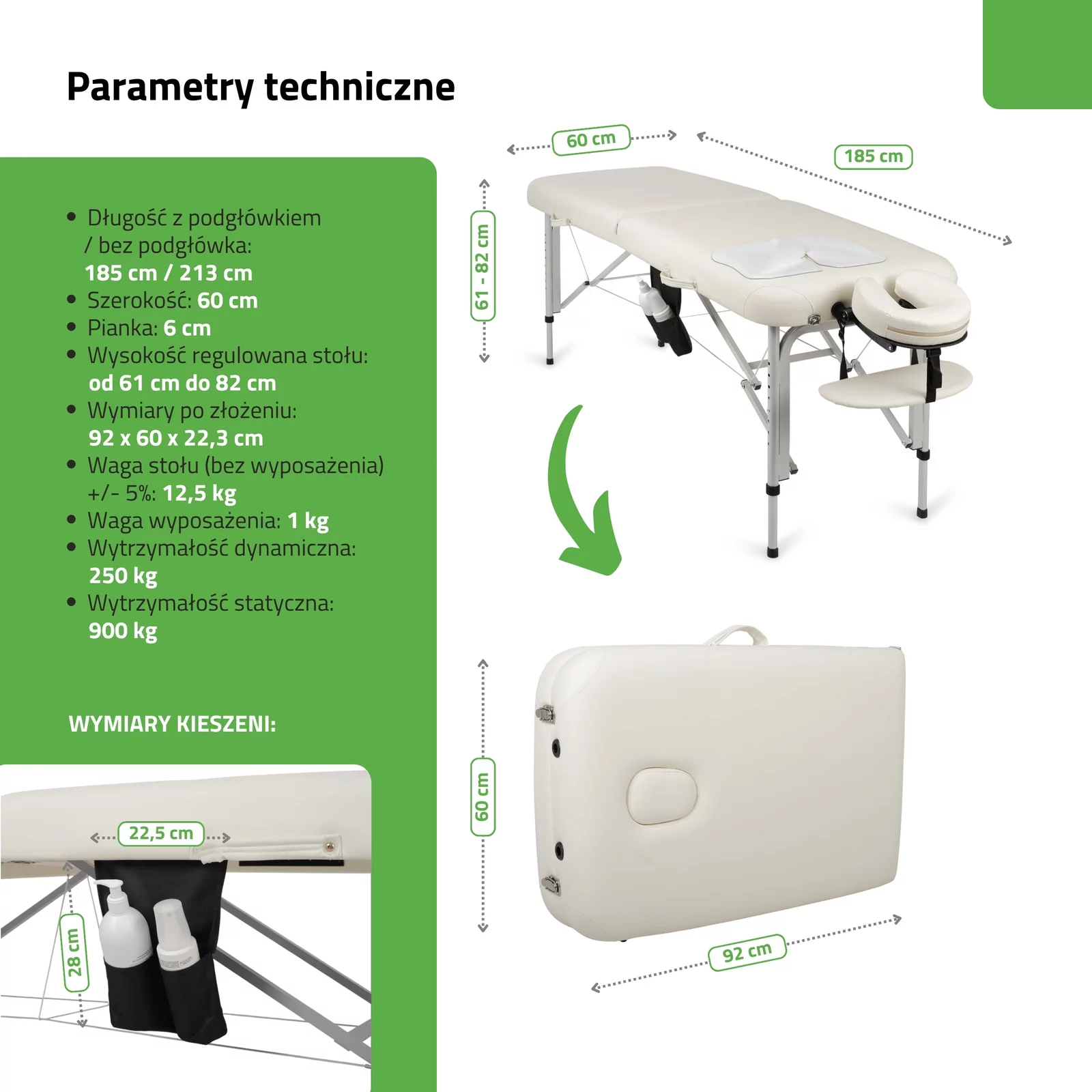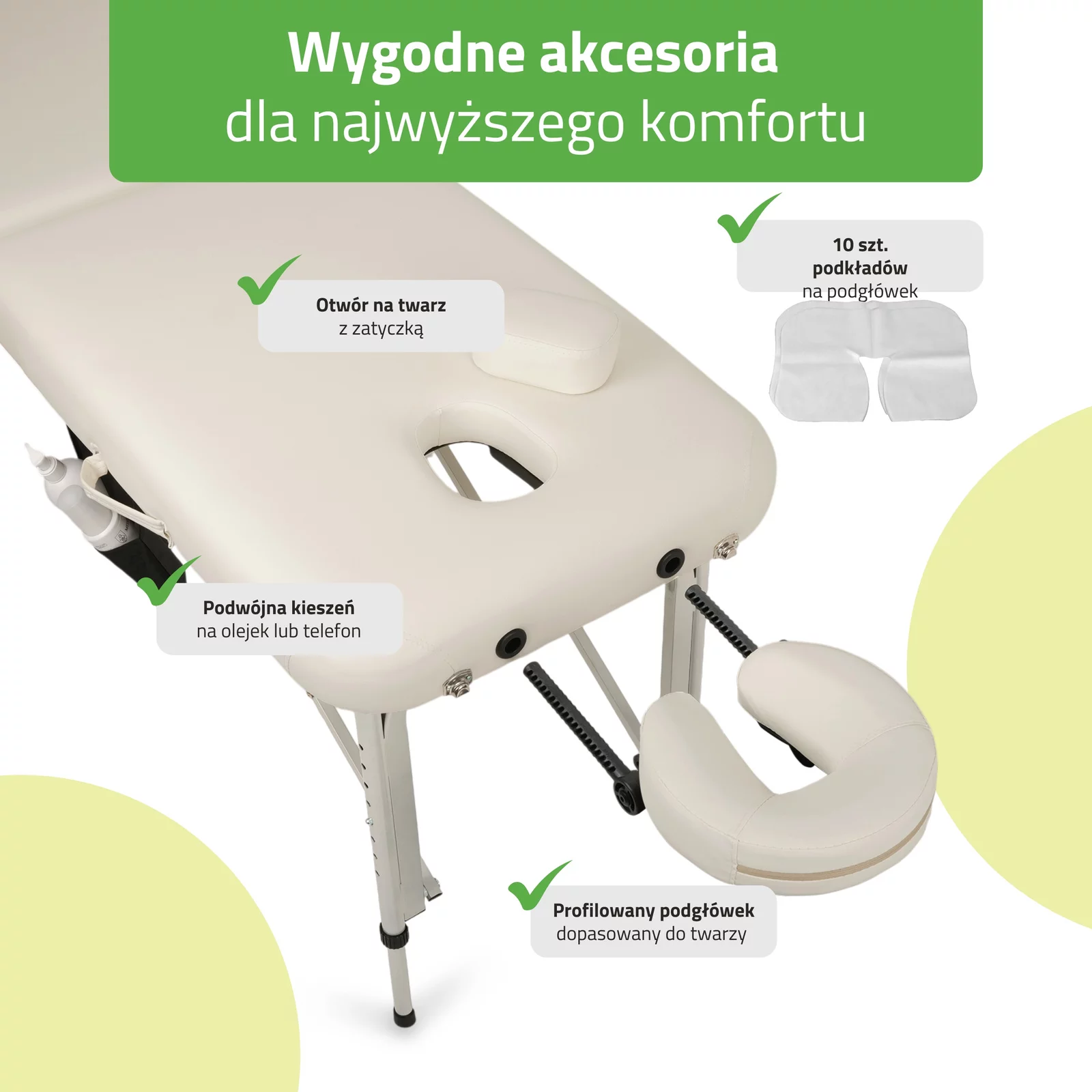 - Kompletny zestaw akcesoriów — regulowany podgłówek, otwór na twarz z zatyczką, podwójna kieszeń na rzep, 10 pokryć jednorazowych, torba transportowa