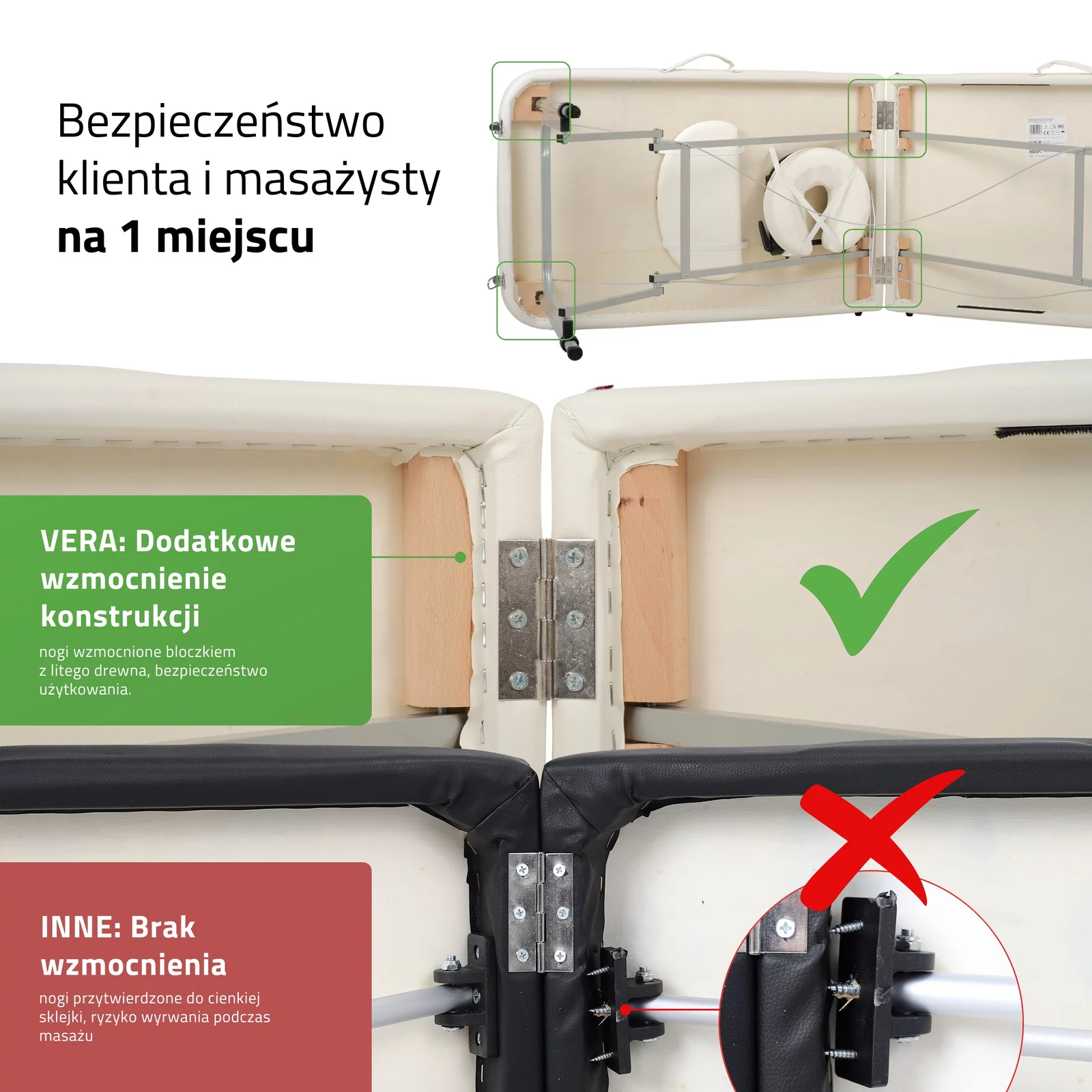 Składany stół do masażu Vera to połączenie mobilności, wytrzymałości i ergonomii, które spełni oczekiwania najbardziej wymagających profesjonalistów. Niezależnie od tego, czy pracujesz w gabinecie, czy dojeżdżasz do klientów, ten aluminiowy stół do masażu zapewni Ci pełną swobodę działania i komfort, na jaki zasługujesz.