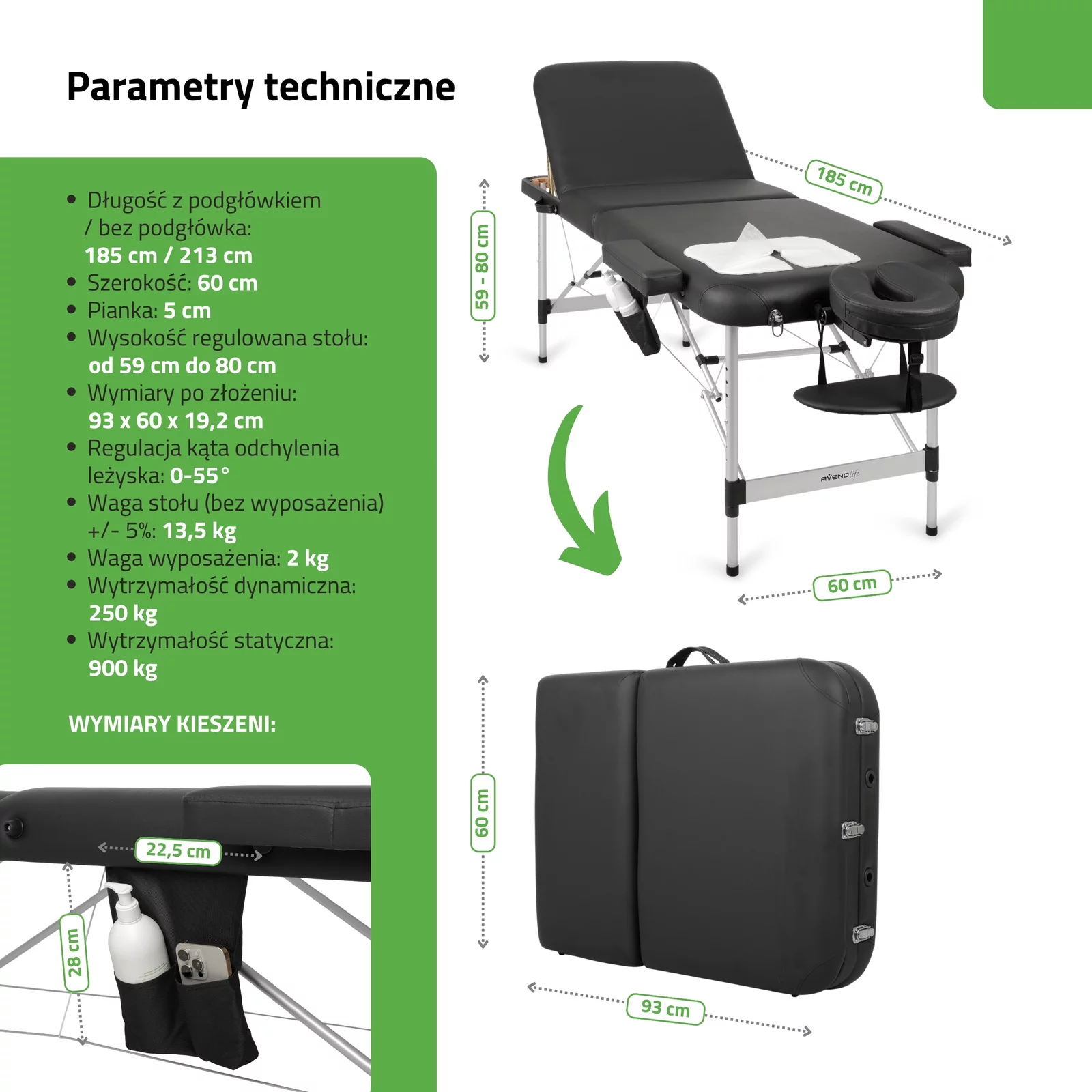 - Kompletne wyposażenie w standardzie — regulowany podgłówek, podłokietniki, otwór na twarz z zatyczką, torba transportowa oraz praktyczne akcesoria, w tym 10 jednorazowych pokryć