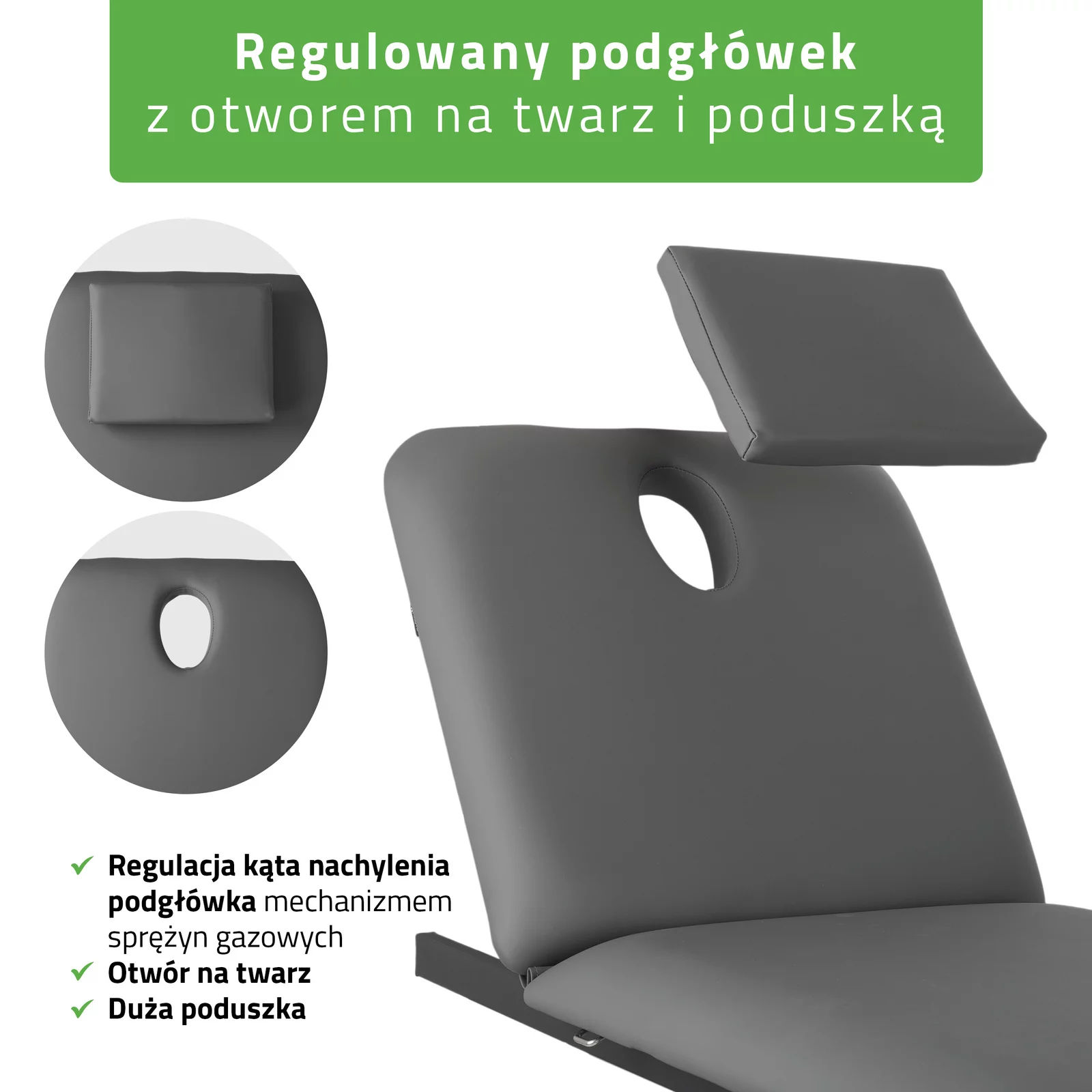 - Otwór na twarz z dużą poduszką — uniwersalne zastosowanie w każdej pozycji
