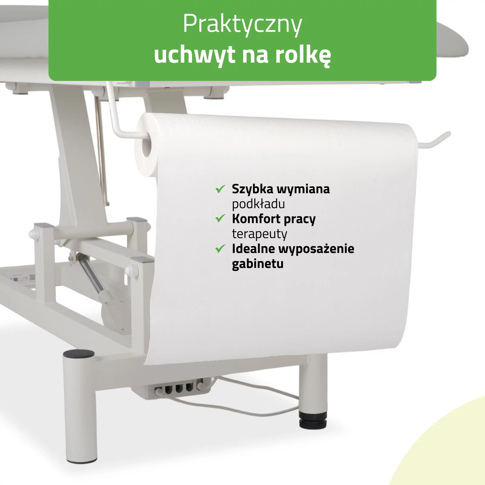 - Praktyczny uchwyt na podkłady — na rolki 60 cm, ułatwiający utrzymanie higieny w gabinecie