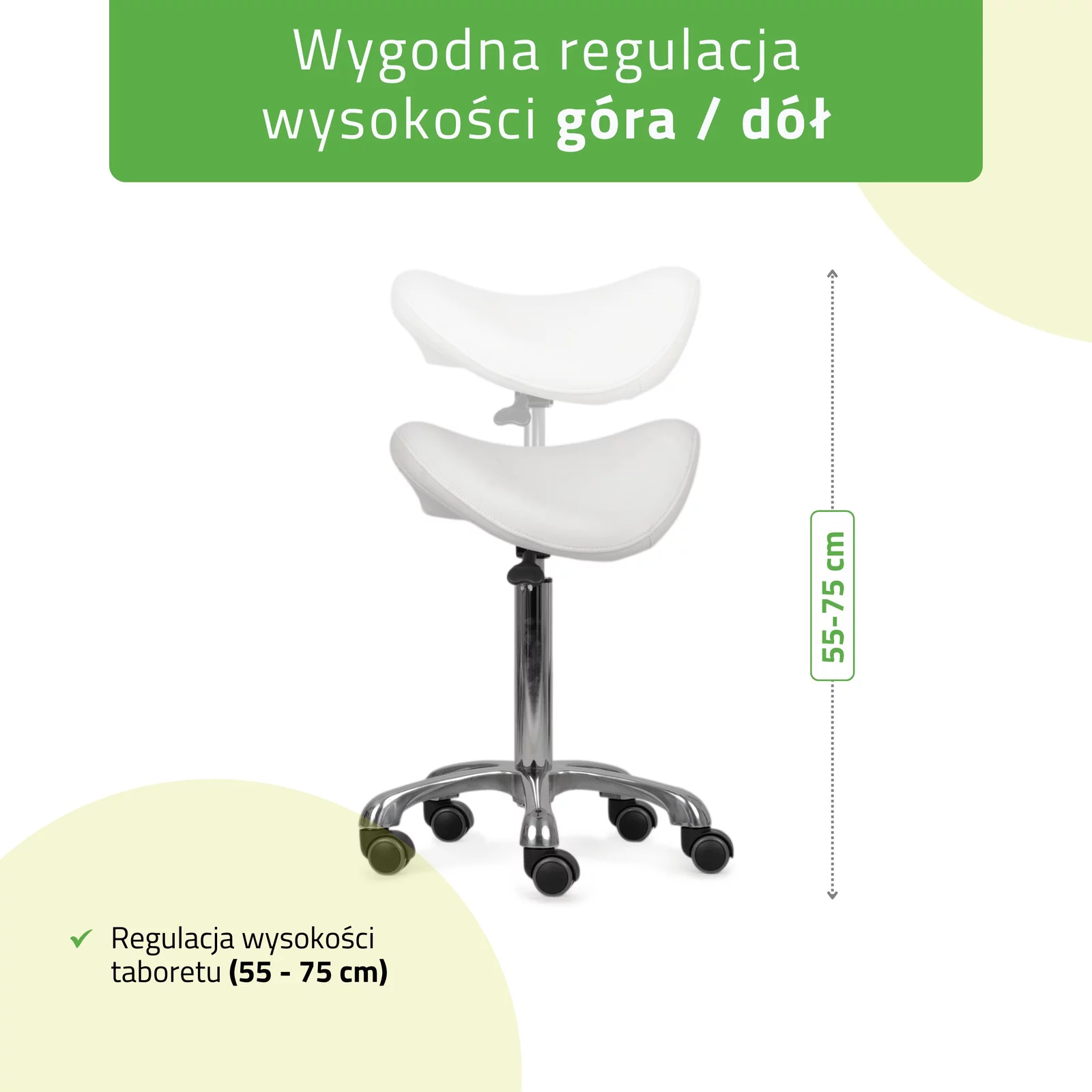 - Płynna regulacja i mobilność – zakres regulacji wysokości 55–75 cm pozwala idealnie dopasować siedzisko do wzrostu użytkownika i wysokości stołu, a kółka umożliwiają błyskawiczne zmiany pozycji bez wstawania