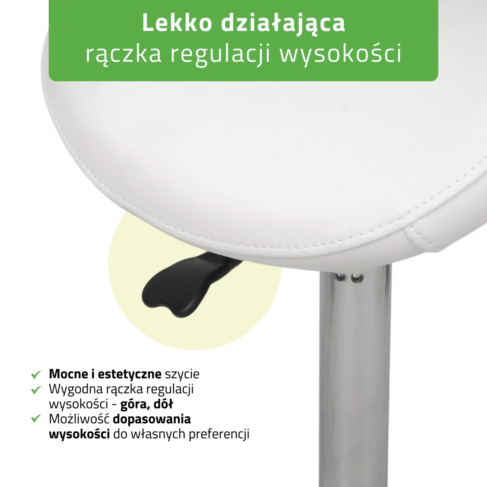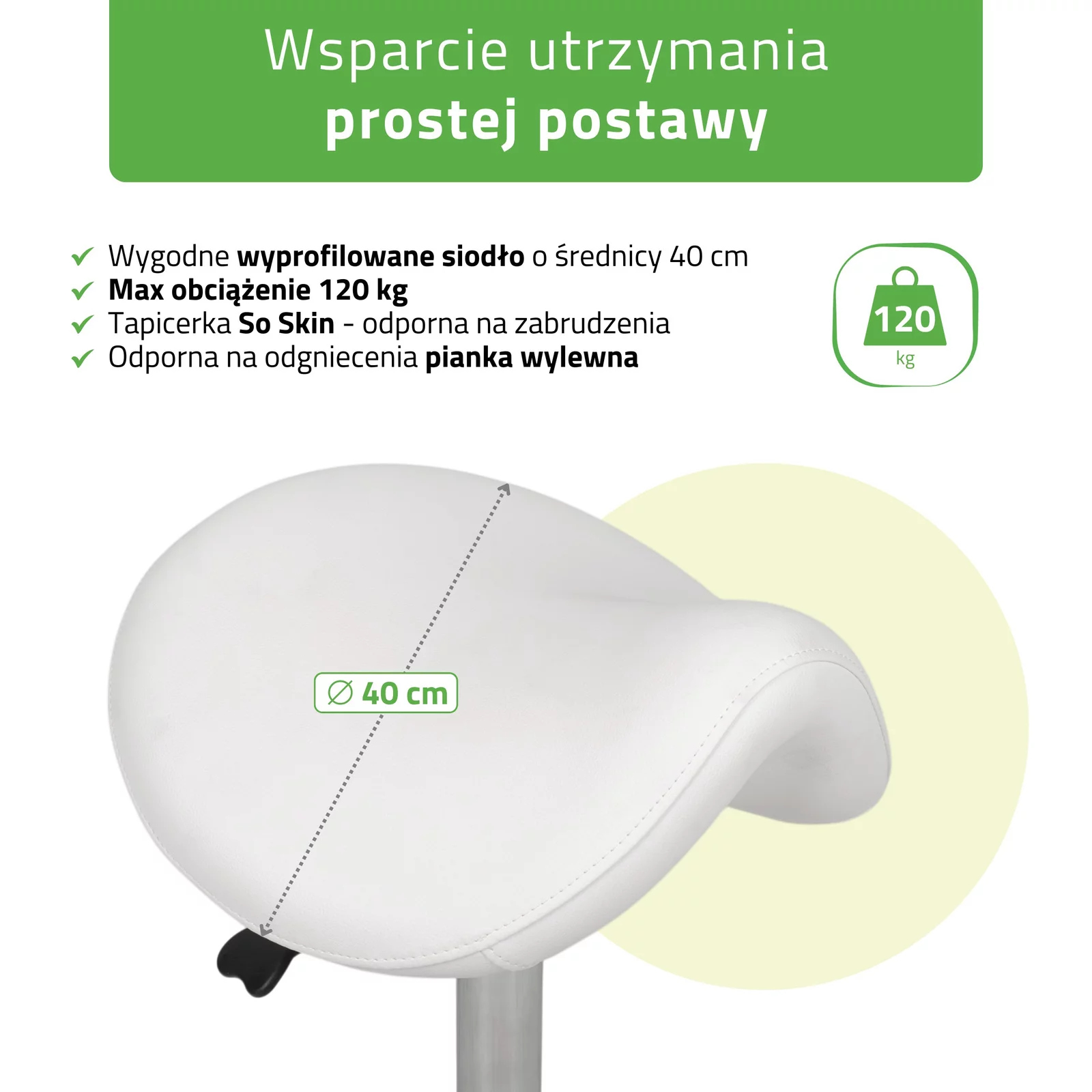 - Trwała tapicerka So Skin – materiał odporny na zabrudzenia, olejki i środki do dezynfekcji, co jest kluczowe przy intensywnej pracy w gabinecie; biały kolor dodaje wnętrzu lekkości